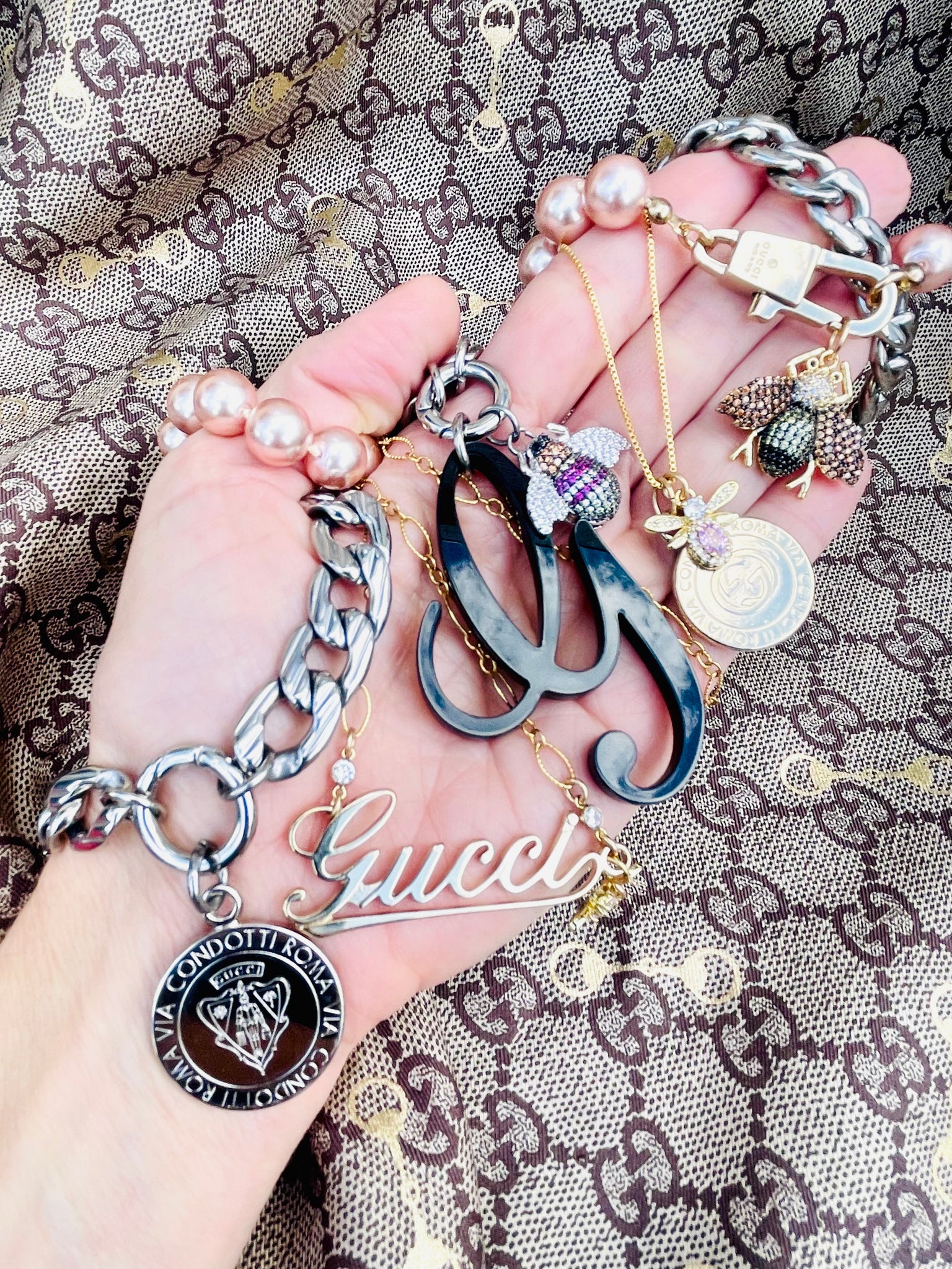 ⚜️ Cursive Gucci G Charm measures 2 1/2”. Multicolored Crystal Pavè Bee Charm measures 3/4”.