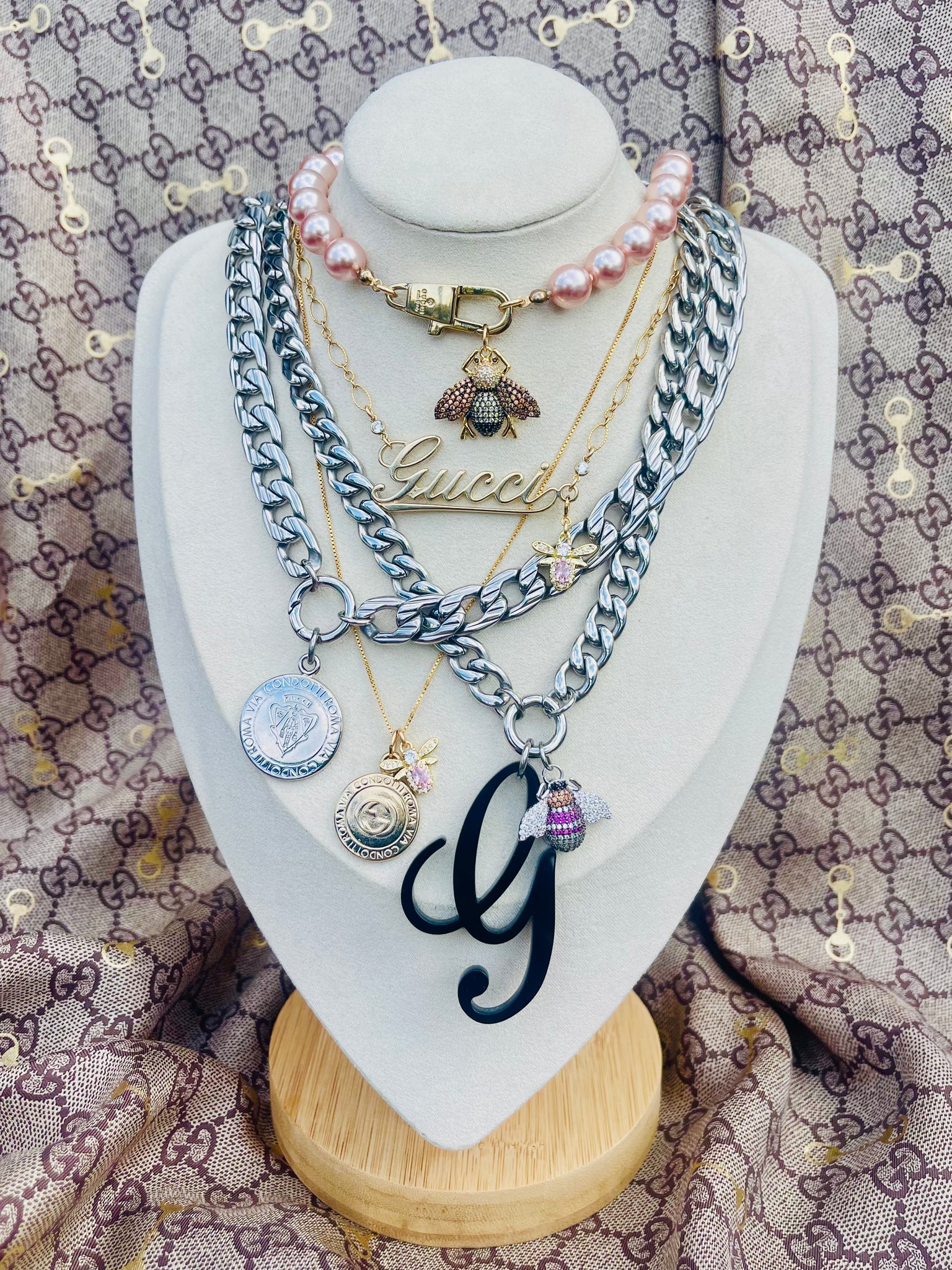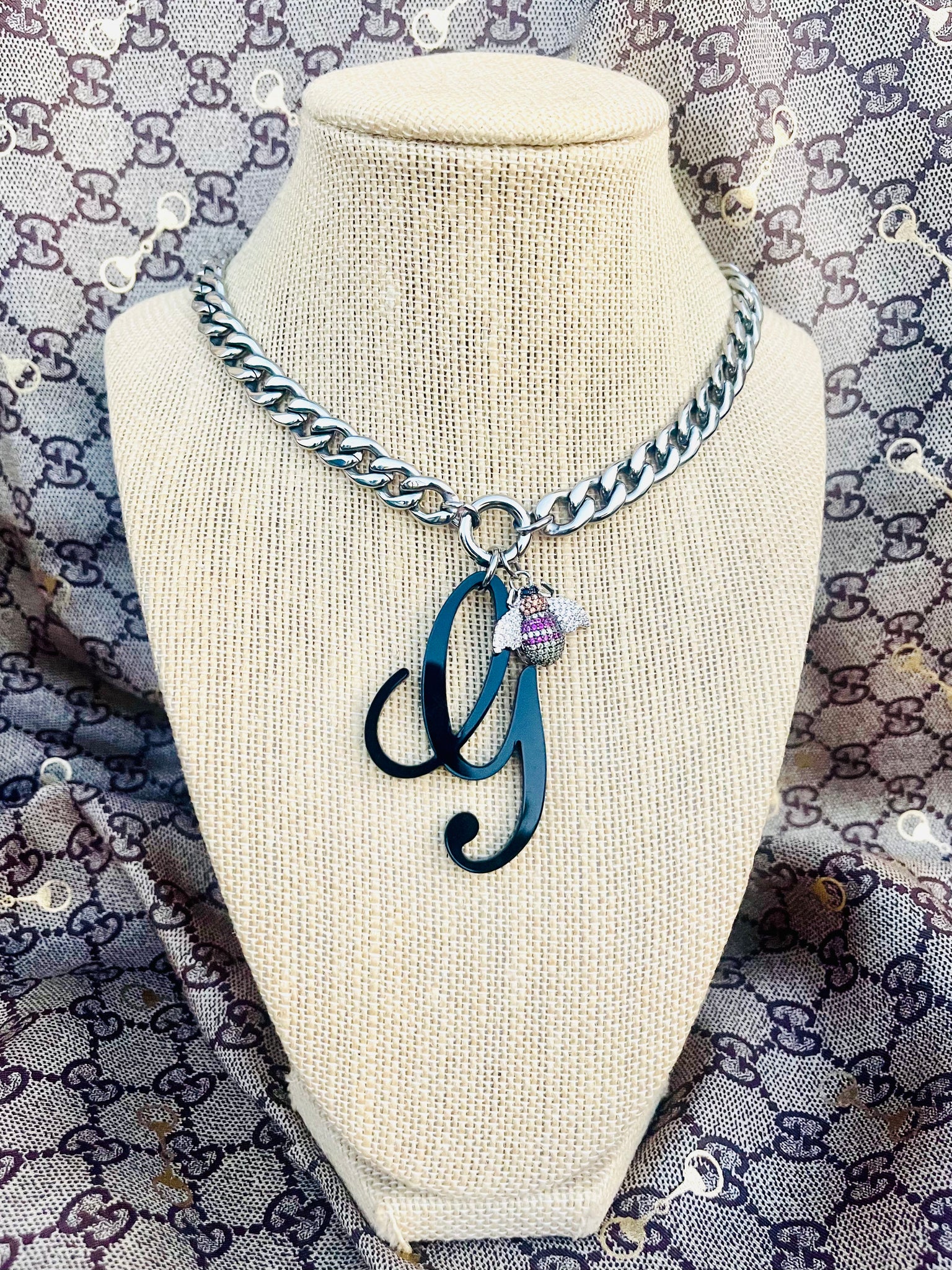 This Amazing Piece was repurposed with a 100% authentic Black Resin Gucci G Charm taken from Gucci Bag Charm, Stainless Steel Chain/Carabiner & 14k Gold Filled Crystal Pavè Bee Charm.