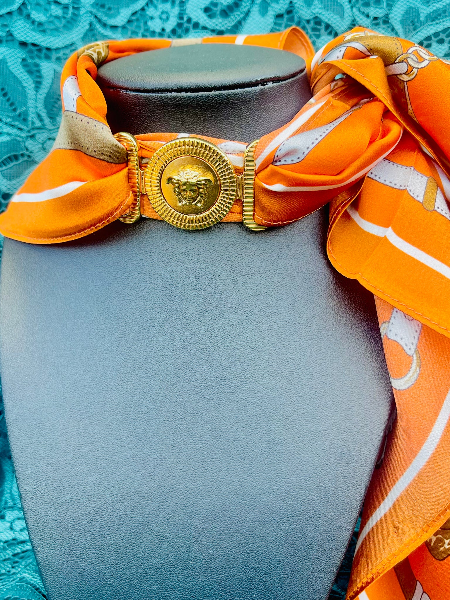 This Iconic Medusa Necklace was repurposed with Iconic Versace Medusa Hardware taken from authenticated sandals and 100% Silk Buttery Soft non~branded scard.