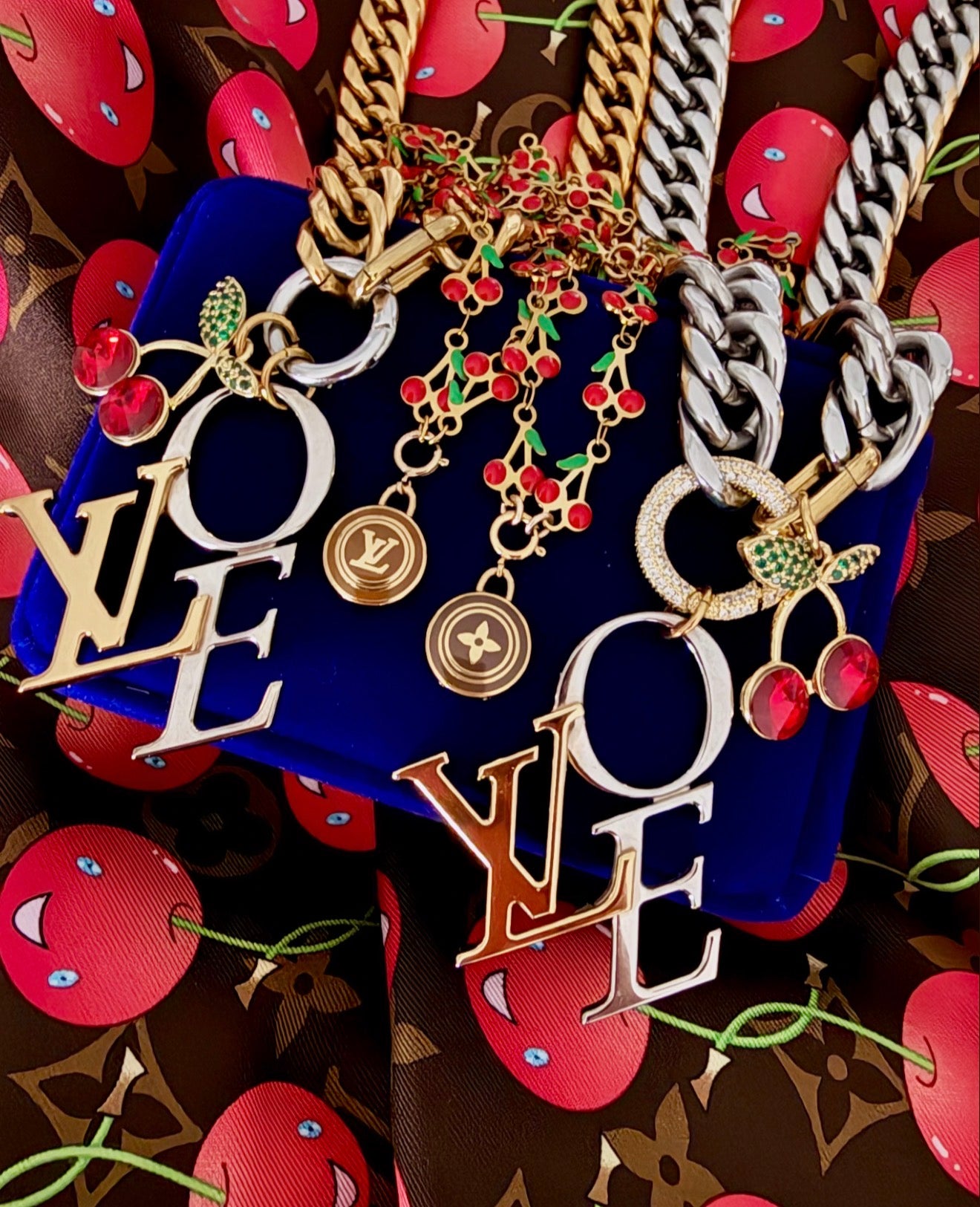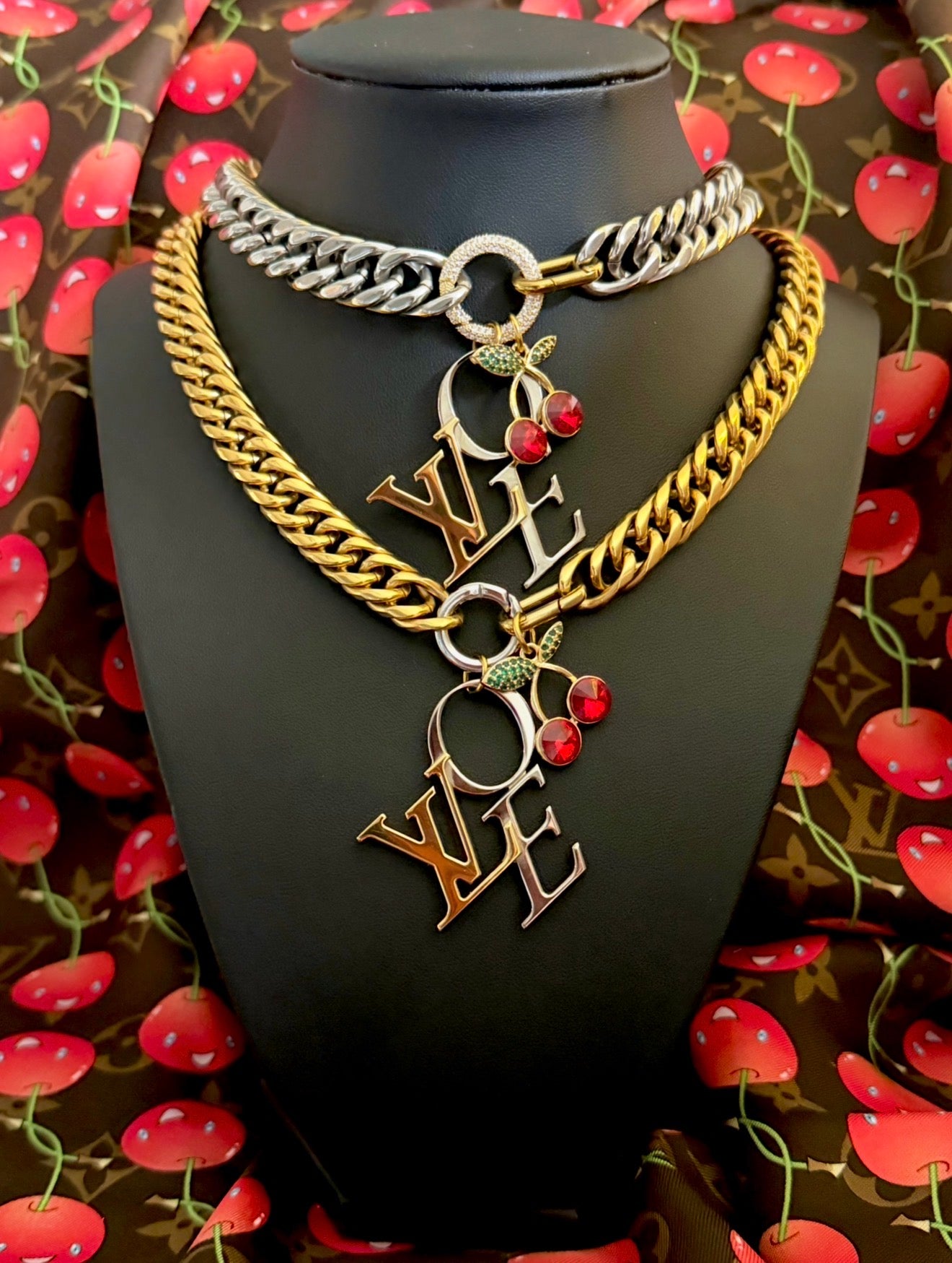 This Stunning X~Large LoVe Necklace was repurposed with 100% authentic Louis Vuitton hardware from authenticated shoes, Solid Stainless Steel Chunky Chain/Carabiners & Stunning 14k Gold Filled Removable Crystal Cherry Charm.