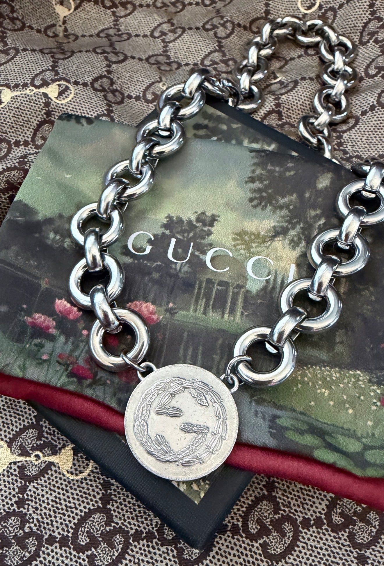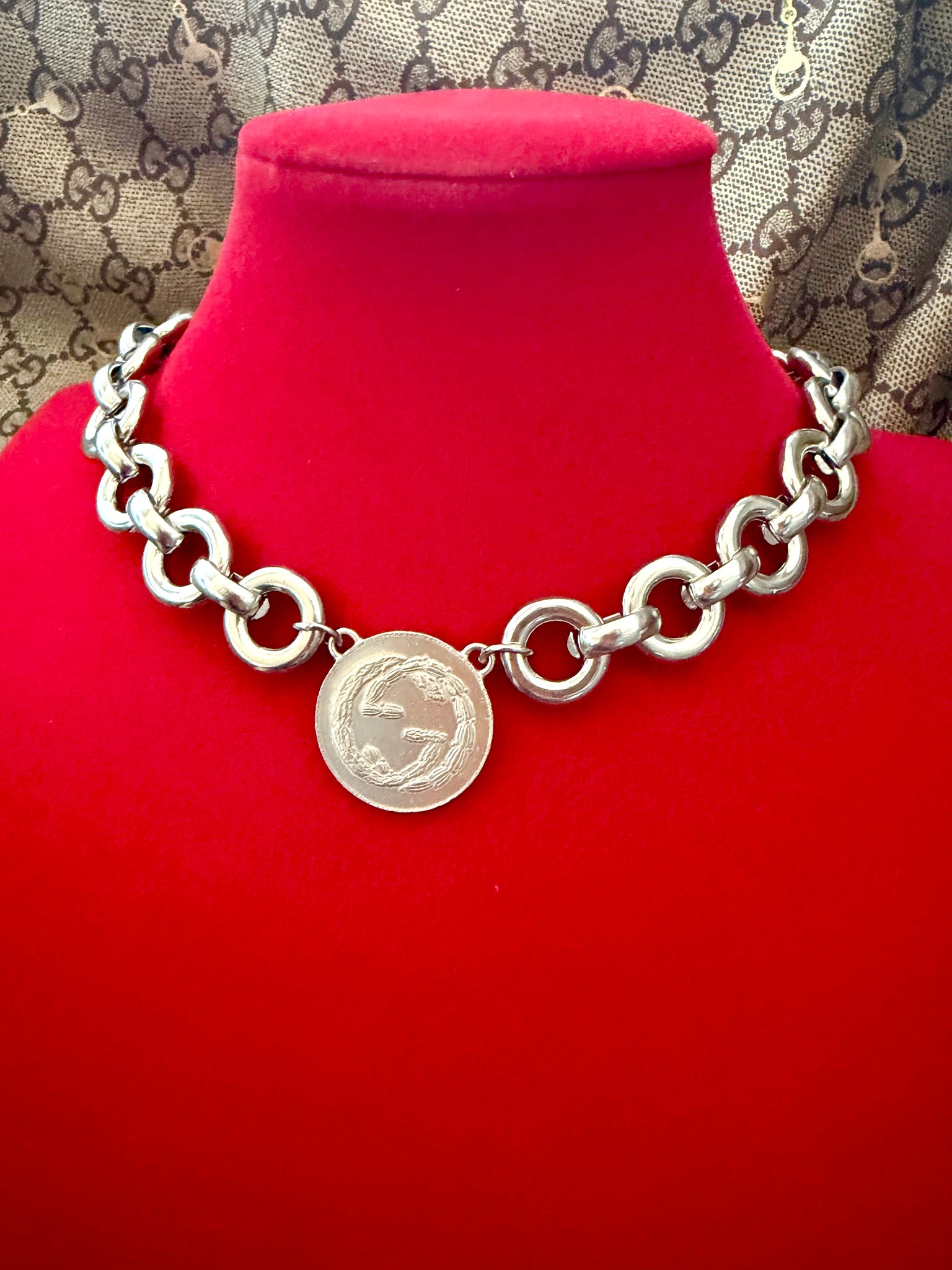 This stunning Two-in-One Necklace was repurposed with Sterling Silver Reversible Interlocking GG/Lucky Hearts 4 Leave Clover Coin from an authentic Gucci Necklace and Solid 316L stainless steel chain/clasp.