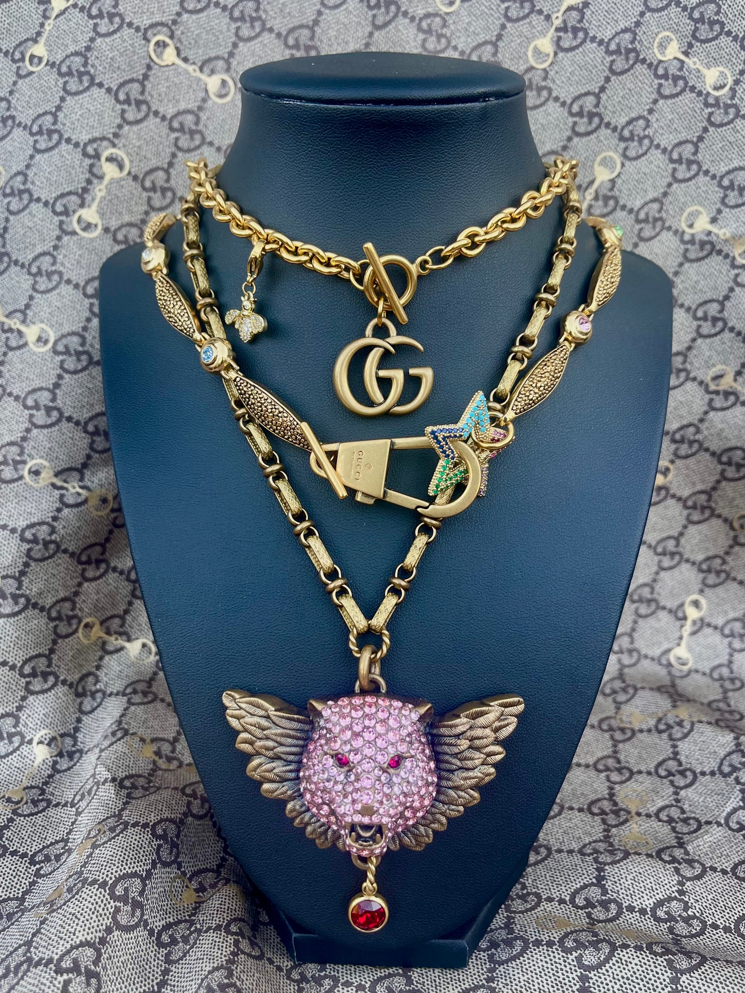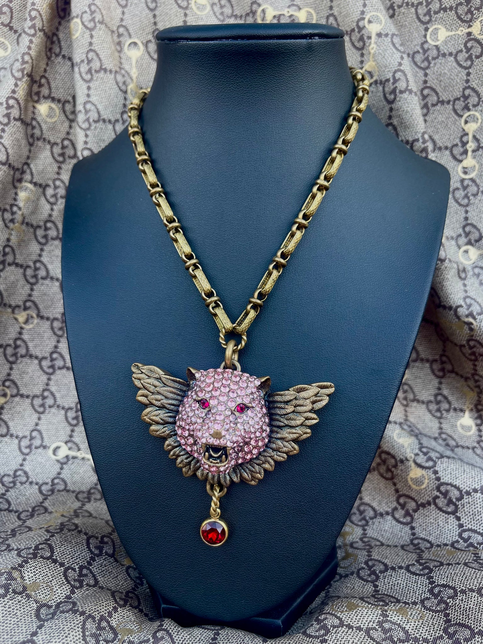 *Very Rare*Repurposed X~Large Gucci Tiger Carved Wings Crystal Statement Necklace