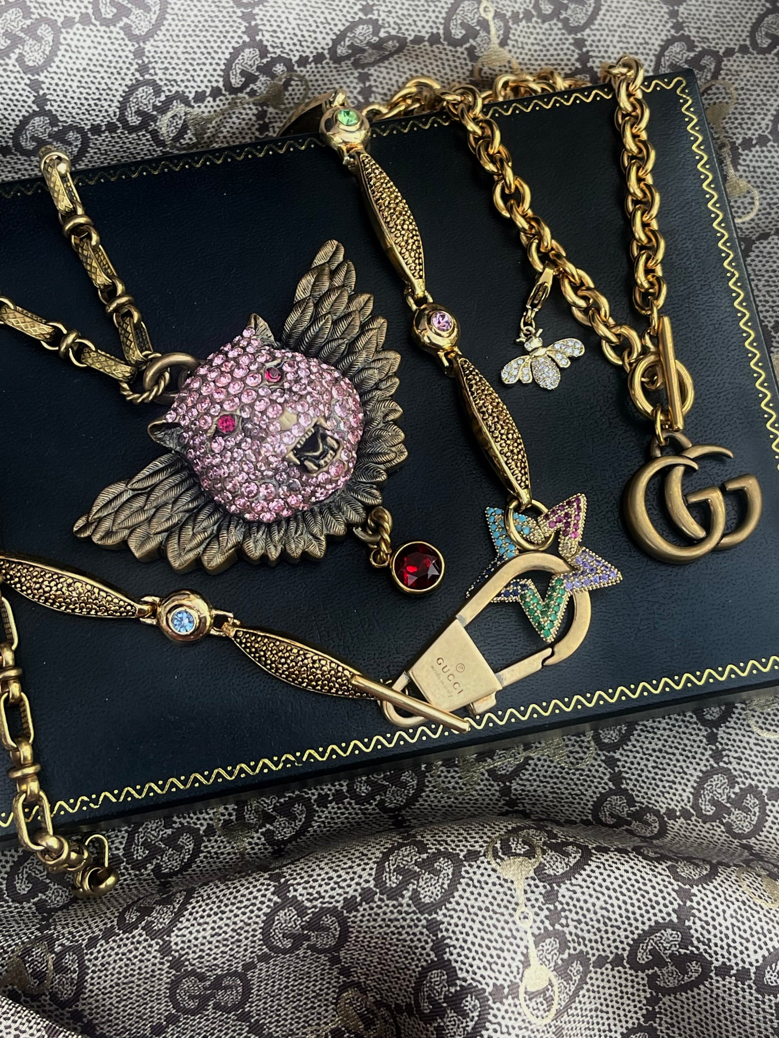 This Stunning & Rare Piece was repurposed with Tiger Wings Crystal X~Large Charm from an authenticated Gucci Keychain, Textured Brasa chain, jump rings and lobster clasp.