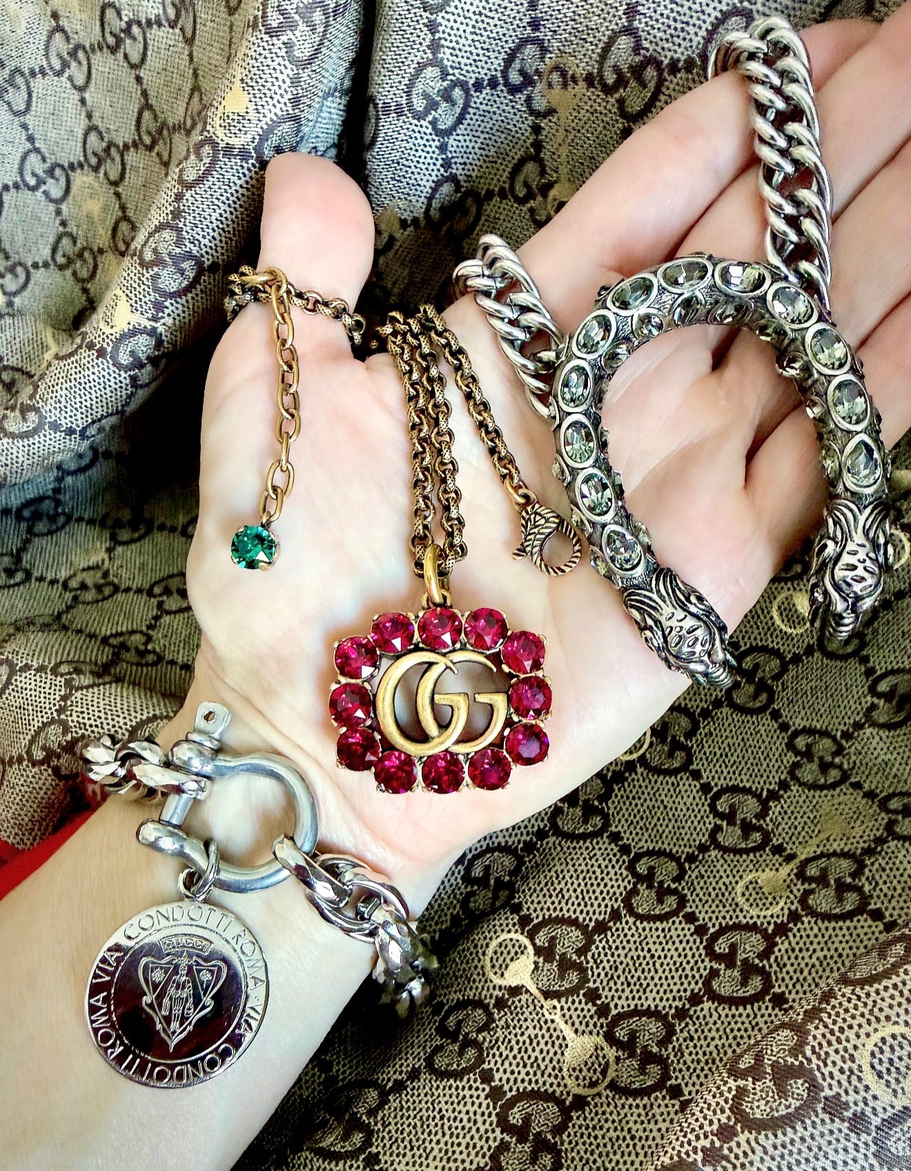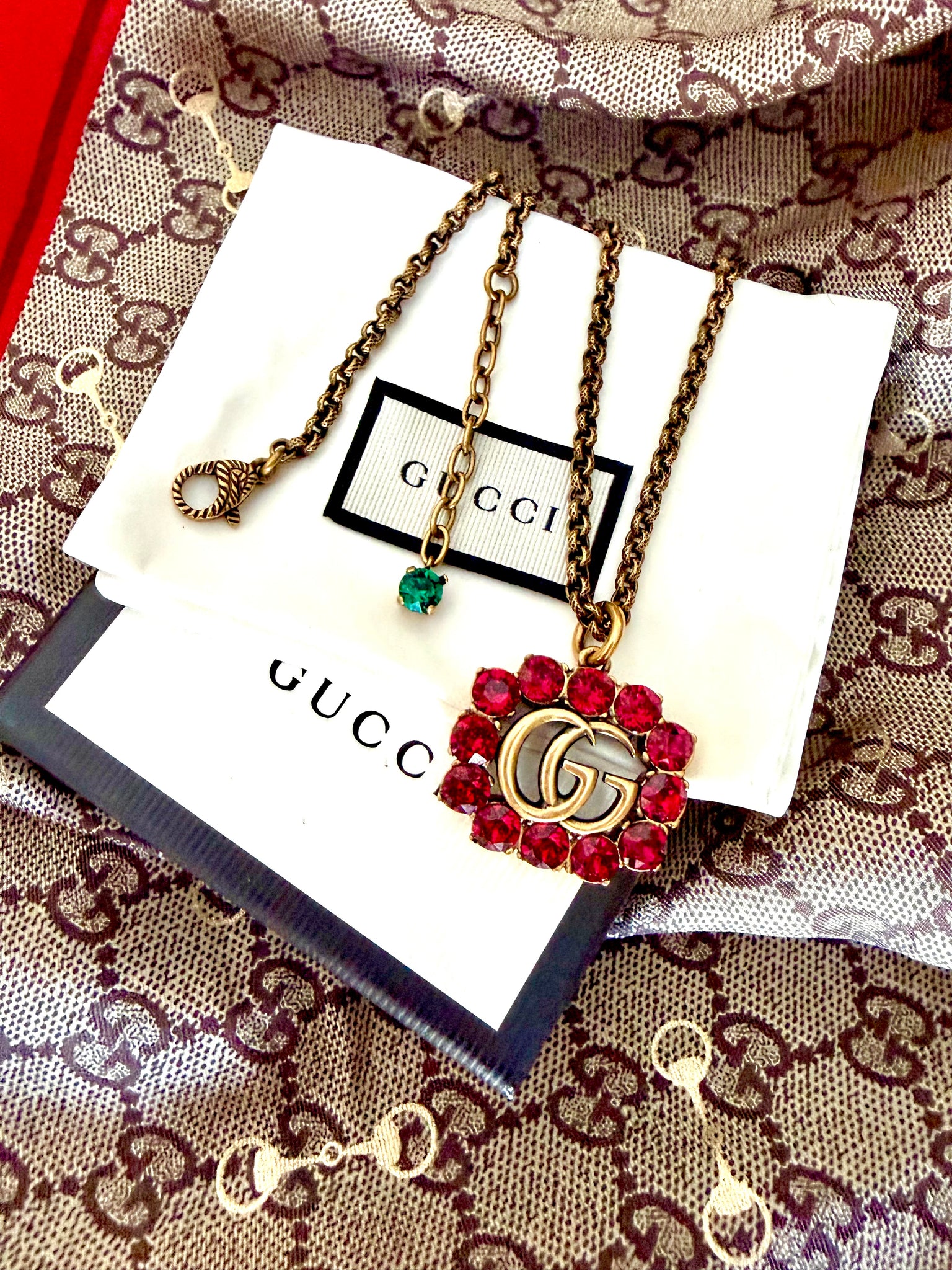 This Sophisticated Pre-Owned Gucci Necklace features an Antiqued Gold GG Ruby Red Crystal Marmont Charm & Adjustable Gucci Rolo Chain with Green Crystal extender accent detail.